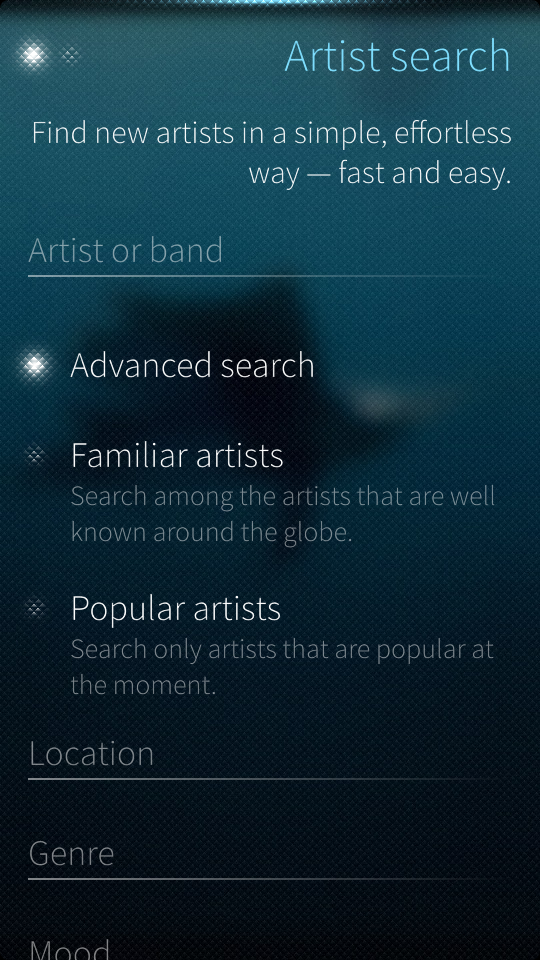 Artistien hakusivu näyttäisi hieman muuttuneen edellisestä videosta. Omasta mielestäni kyseessä on paljon selkeämpi ulkoasu isoimpine fontteineen. Myös advanced search näyttäisi olevan päällä, jonka alta paljastuu seuraavat vaihtoehdot: